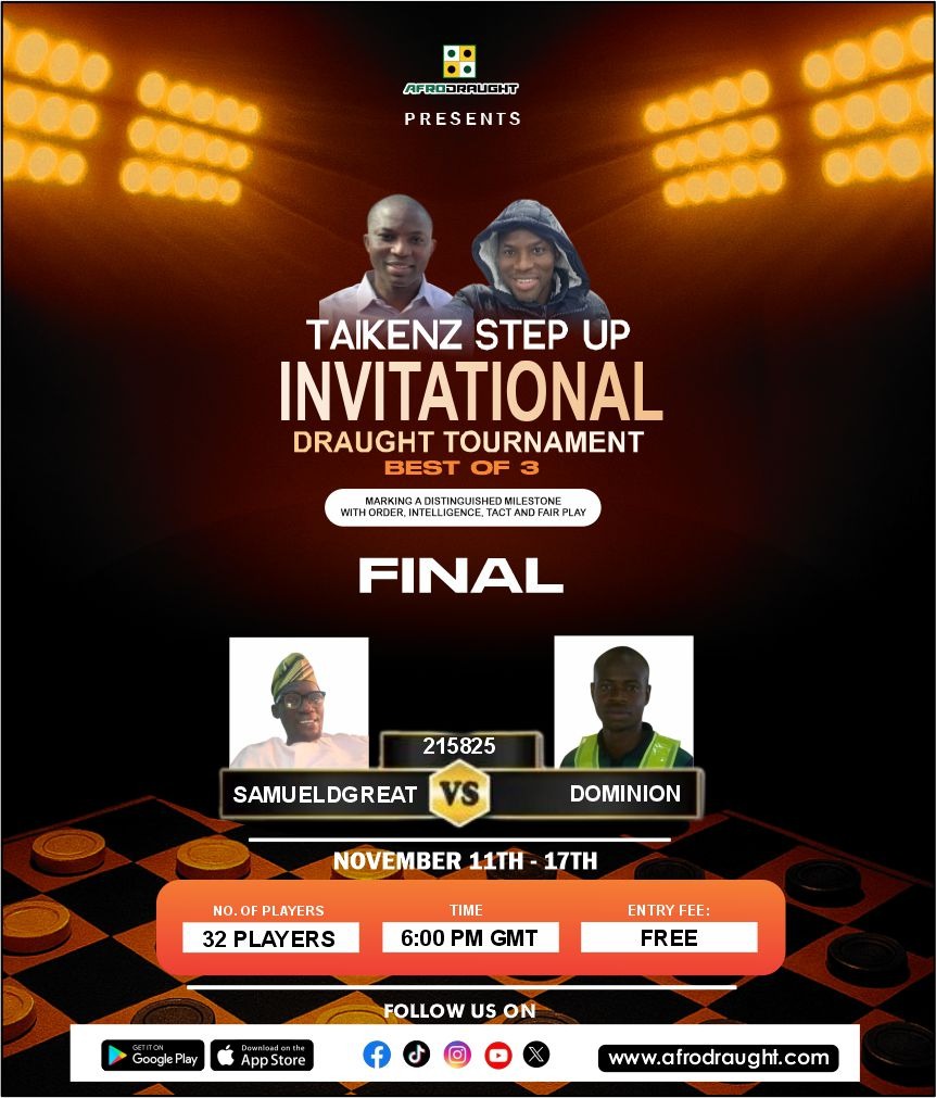 After a superb match from notable players on Afrodraught in the taikenz invitational draught tournament hosted by Kenny id and Speedy in the 32 players match up in the knockout stages the finalist has emerge Samueldgreat and Dominion and they are set to battle 6:15 pm GMT